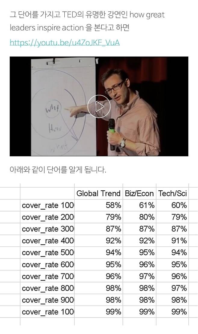 토익 같은 경우는 모의 고사를 분석해보면 7000개 정도 외우면 토익에 나오는 단어의 90% 이상을 알게 되기 때문에 단어 때문에 어떤 단어장으로 공부한 것보다도 완벽하게 시험을 준비할 수 있습니다. 그런데 다시 위로 돌아가서 보세요. 7000개를 외우면 스티브잡스 연설, 테드 강연, 베조스 레터 95% 이상의 단어를 알게 됩니다. 어설프게 시험을 보려고 단어를 외우는 것이 아니라 이렇게 단어를 한 번 미친 듯이 빡세게 외우면 평생 써먹을 수 있다는 이야기입니다.