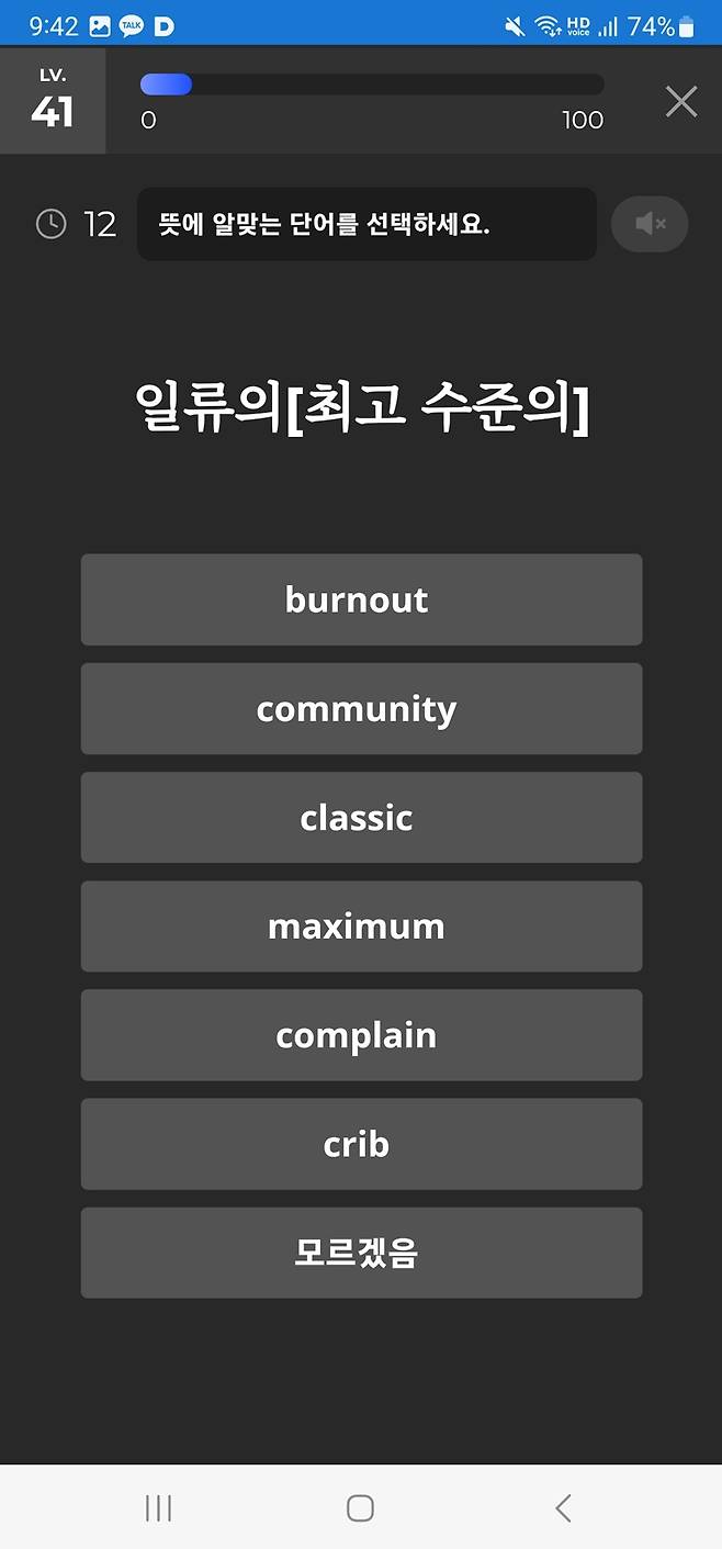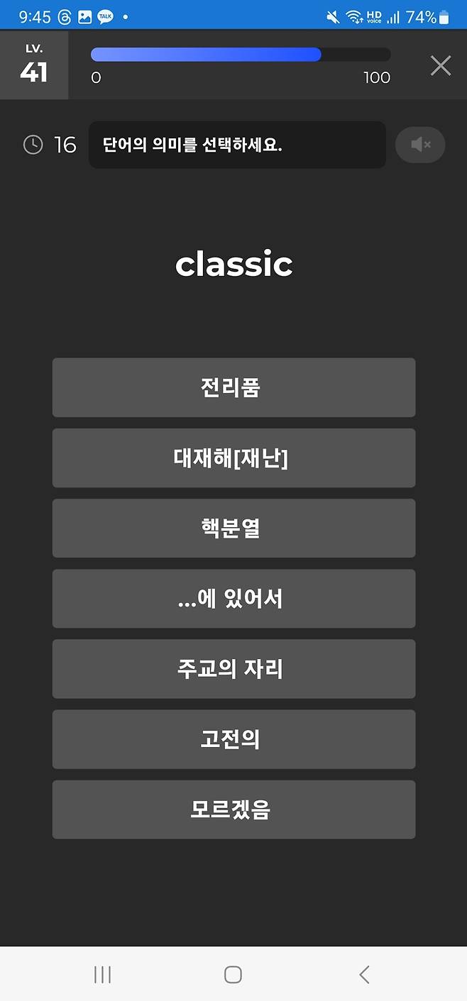 아래처럼 퀴즈로 풀기 때문에 장기기억 측면에서 몰입도 측면에서 압도적으로 유리합니다. 그리고 그냥 형식적으로 푸는 것이 아니라 영어-한글 구조를 풀었는데 퀴즈를 틀리면 인공지능이 다시 풀 때 한글-영어 구조를 출제 할 가능성이 높고, 그러면서 아래 클래식 경우처럼 정답의 뜻도 바꿔서 출제하기 때문에 진짜 장기기억에 최적으로 설계가 된 시스템입니다.