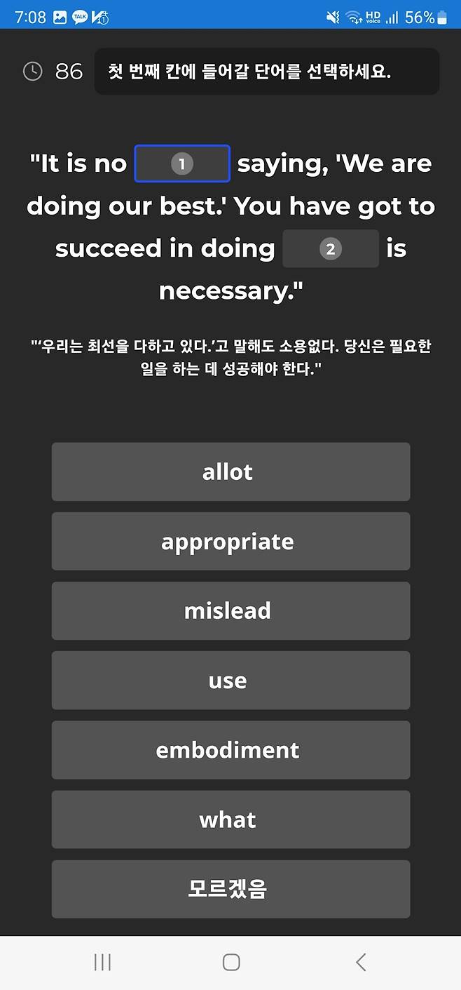 일반퀴즈로 뜻을 이해했으면 독해력을 올리기 위해 아래 나온 것처럼 [초급독해: 빈칸 하나 맞추기], [중급독해: 빈칸 두 개 맞추기], [고급독해: 해석 보지 않고 빈칸 하나 맞추기] 이렇게 퀴즈를 계속 풀면 틈틈이 공부해도 어떤 방법보다 어휘력이 빨리 올라가게 됩니다. 이미 수 많은 분들이 퀴즈를 풀면서 독해력을 비약적으로 향상시켰습니다.
