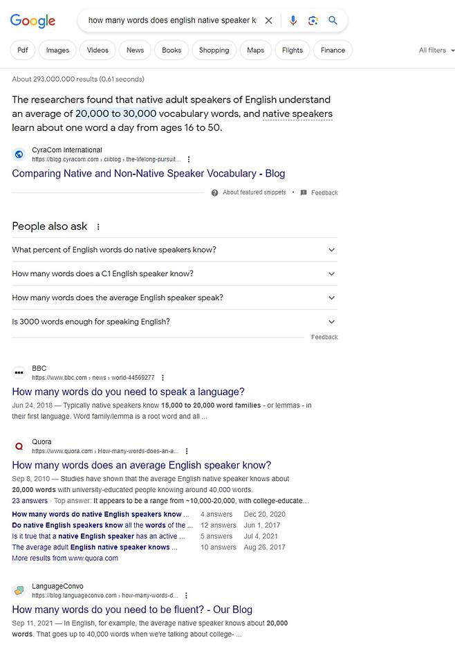100번을 강조해도 지나침이 없습니다. 단어를 외우지 않고는 어떤 언어도 잘 할 수가 없습니다. 그건 마치 쌀 없이 밥을 짓겠다는 것과 전혀 다를 게 없습니다. 독해를 통해서 정보를 얻으려면 당연히 단어를 정말 많이 알아야 하고, 회화가 목적이라면 상대적으로 적은 단어를 알아도 되지만 그래도 최소한의 단어는 외워야 합니다. 과연 몇 개를 외워야 할까요? 원어민은 대략 정말 보수적으로 잡으면 10000개 그리고 대학 교육을 받거나 교양이 풍부하면 40000개의 단어를 알고 있다고 합니다. 그러면 여러분이 만약에 전문 통역가가 되려면 앞에 임종령 통역사님 경우처럼 30000개 이상은 알아야 합니다. 하지만 간단한 회화를 하고 관련 업무에서 영어로 진행하고 싶다면 멱법칙을 근거로 빈도 상위 20% 단어를 아는 것이 무엇보다 중요합니다. 회회 목적으로는 2000~5000개, 독해 목적으로는 7000~10000개 정도만 외우면 외국인으로써 영어를 하는데 큰 문제가 없습니다.