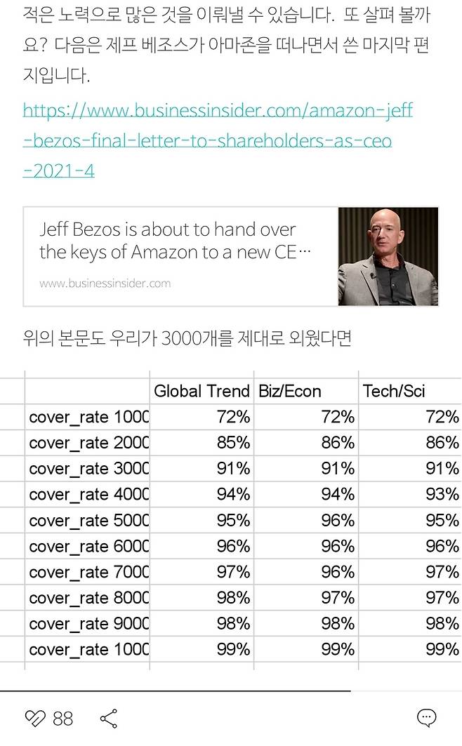 다시 한 번 마지막으로 통계적으로 검증된 우선순위로 공부하는 것이 얼마나 중요한지 사례를 말씀 드리겠습니다. 아래 예시는 스티브 잡스의 스탠포드 대학 졸업식 축사 그리고 테드 최고 인기 강연 중 하나, 마지막으로는 제프 베조스가 CEO에서 은퇴하면서 쓴 편지를 분석해보면 3000개만 외워도 사용된 단어의 약 90% 정도를 마스터한 것을 볼 수 있습니다.