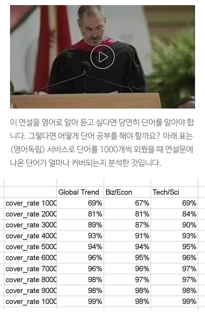다시 한 번 마지막으로 통계적으로 검증된 우선순위로 공부하는 것이 얼마나 중요한지 사례를 말씀 드리겠습니다. 아래 예시는 스티브 잡스의 스탠포드 대학 졸업식 축사 그리고 테드 최고 인기 강연 중 하나, 마지막으로는 제프 베조스가 CEO에서 은퇴하면서 쓴 편지를 분석해보면 3000개만 외워도 사용된 단어의 약 90% 정도를 마스터한 것을 볼 수 있습니다.