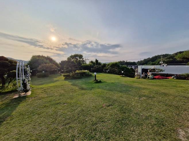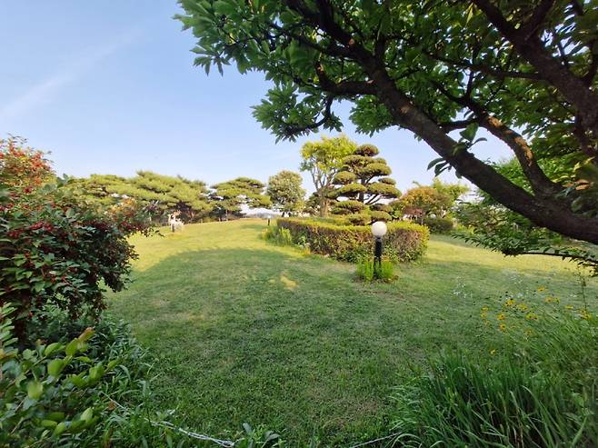 우선 시간이 남아 건물 뒤편의 언덕을 거닐어 보기로 했다. 나무 침목을 놓아 걷는 이들을 배려하고 오르는 길 좌우로 난생 처음보는 들꽃들이 반겼다. 언덕 정상에는 잔디밭이 펼쳐져 있고 군데군데 테이블과 의자를 놓아 쉬고 갈 수 있게 했다. 식사를 마친 손님들이 이 언덕에 올라 사진 촬영을 하는 모습이 참 보기 좋았다. 야트막한 언덕이지만 주변에 큰 산이 없어 시야가 뻥 뚫려 풍경 맛집이라고 해도 과언이 아니다. 이 정원을 만들기 위해 십 수 년간 쏟아부었을 주인장의 노력이 보지 않아도 그려진다.