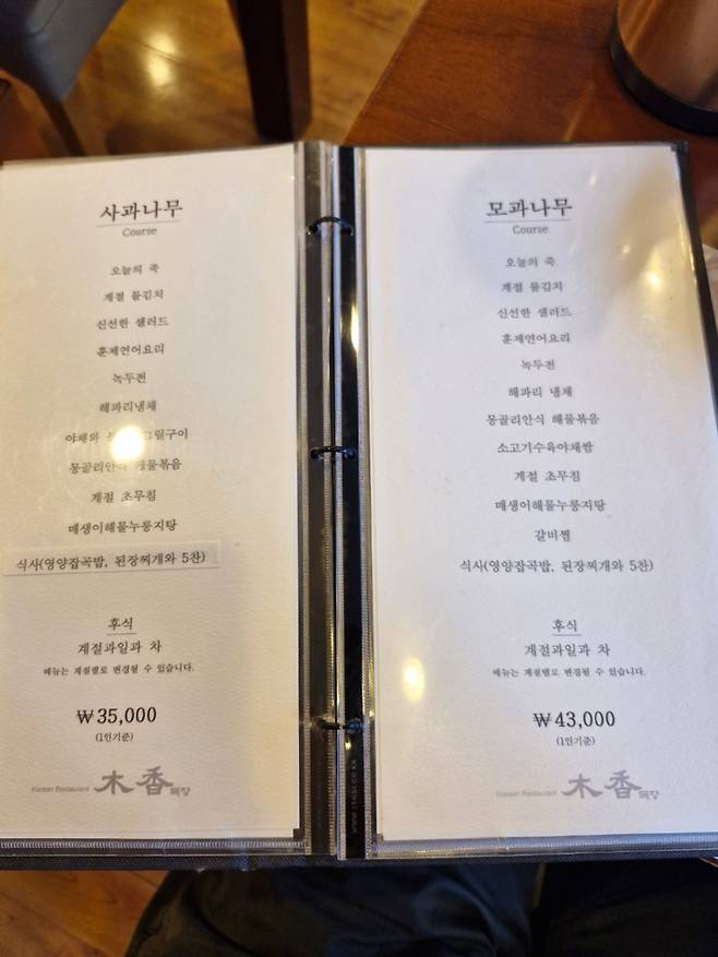 일단 메뉴판부터 펼쳐봤다. 이른바 코스 메뉴가 6가지가 있다. 가장 저렴한 목향이 3만원이고, 이어 사과나무, 모과나무, 대추나무, 은행나무, 목련나무 메뉴가 있다. 가장 비싼 목련나무는 1인당 6만2천원이다. 우리는 1인당 4만3천원짜리 모과나무 코스를 주문했다. 왜냐하면 그 아래 목향과 사과나무는 고기를 찾아볼 수 없었기 때문이다. 거의 다 말 그대로 풀때기다.