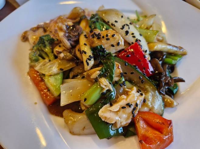 모과나무 코스에 나오는 요리들은 오늘의 죽을 시작으로 물김치, 샐러드, 훈제연어, 녹두전, 해파리 냉채, 몽골리안식 해물볶음, 소고기수육, 초무침, 매생이해물누룽지탕, 갈비찜, 그리고 식사다. 고기는 한우도 아닌 미국산이다.