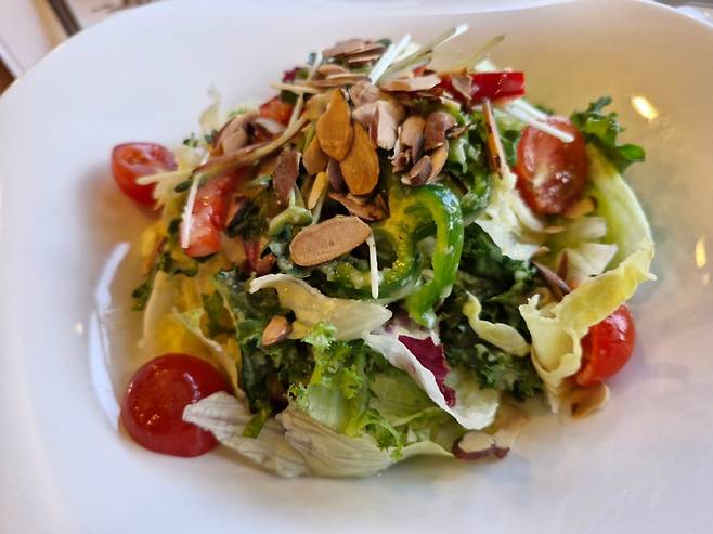 입맛이 까다로운 둘째가 요리가 몇 개 나오고 나서 표정이 일그러졌다. 맛이 별로란다. 고기를 좋아하는 둘째는 소고기수육과 갈비찜을 기대했는데 소고기수육은 퍽퍽했고(심지어 수육을 와사비 소스에 찍어먹는 것도 아이러니) 갈비찜은 이게 4인분인가 싶을 정도로 양이 적었다. 나머지 음식들도 맛이 나쁘진 않았지만 한정식이 아닌 그냥 한식과 중식, 양식을 대충 섞은 퓨전 느낌이 났다. 열 가지 정도의 음식 중에 정말 맛있다 싶은 게 하나도 없다. 나이든 어르신들과 함께 온 가족들도 꽤 보이는데 어르신들이 먹을 만한 게 뭐 있나 하는 의문도 든다.