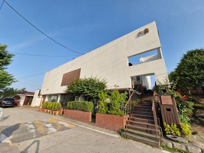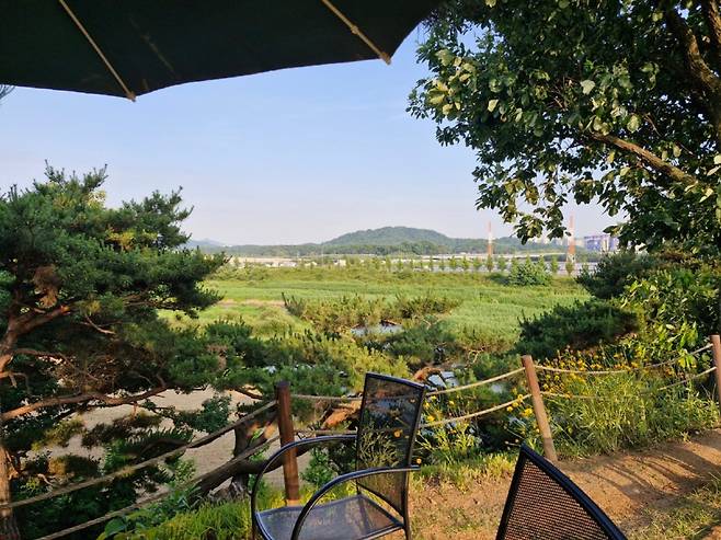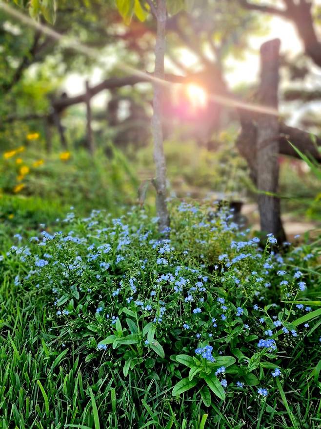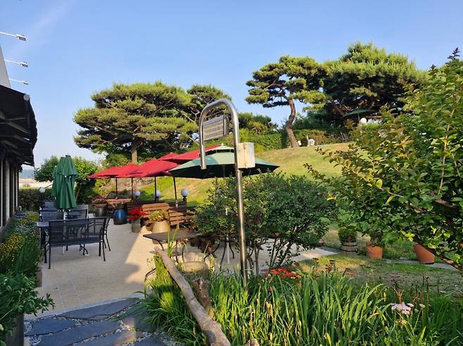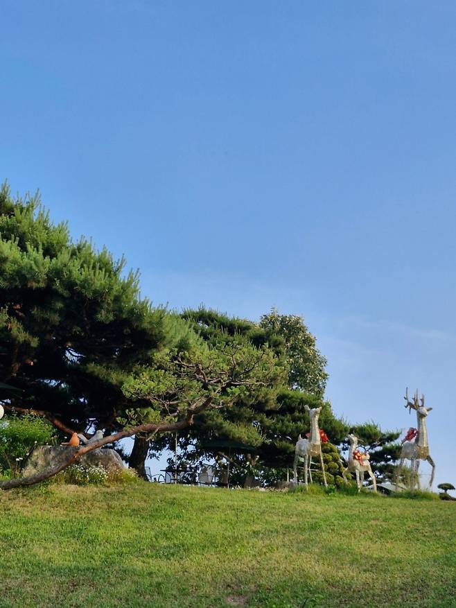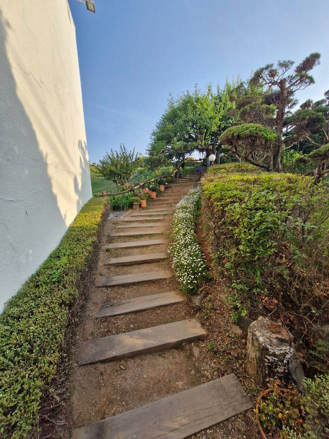 우선 시간이 남아 건물 뒤편의 언덕을 거닐어 보기로 했다. 나무 침목을 놓아 걷는 이들을 배려하고 오르는 길 좌우로 난생 처음보는 들꽃들이 반겼다. 언덕 정상에는 잔디밭이 펼쳐져 있고 군데군데 테이블과 의자를 놓아 쉬고 갈 수 있게 했다. 식사를 마친 손님들이 이 언덕에 올라 사진 촬영을 하는 모습이 참 보기 좋았다. 야트막한 언덕이지만 주변에 큰 산이 없어 시야가 뻥 뚫려 풍경 맛집이라고 해도 과언이 아니다. 이 정원을 만들기 위해 십 수 년간 쏟아부었을 주인장의 노력이 보지 않아도 그려진다.