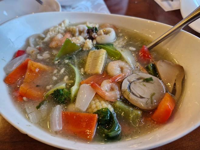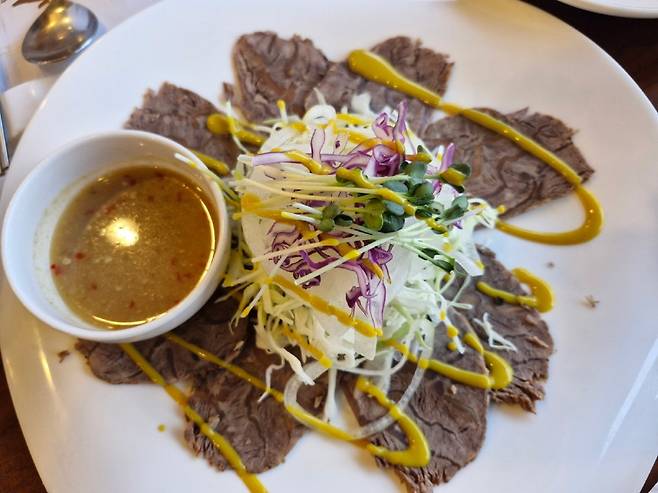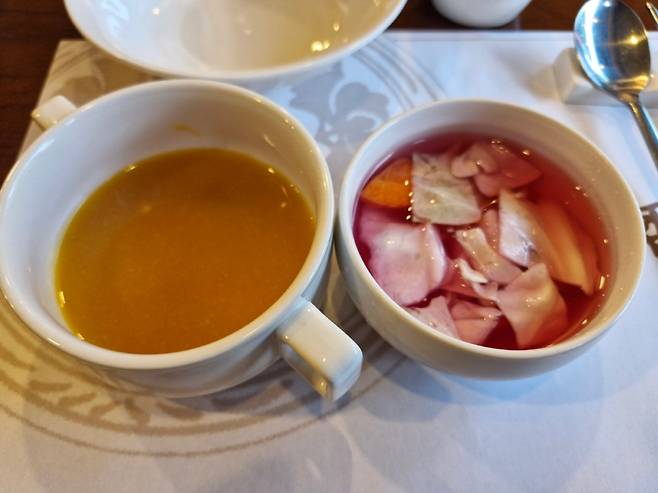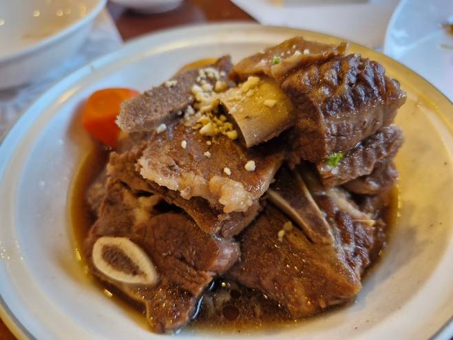 입맛이 까다로운 둘째가 요리가 몇 개 나오고 나서 표정이 일그러졌다. 맛이 별로란다. 고기를 좋아하는 둘째는 소고기수육과 갈비찜을 기대했는데 소고기수육은 퍽퍽했고(심지어 수육을 와사비 소스에 찍어먹는 것도 아이러니) 갈비찜은 이게 4인분인가 싶을 정도로 양이 적었다. 나머지 음식들도 맛이 나쁘진 않았지만 한정식이 아닌 그냥 한식과 중식, 양식을 대충 섞은 퓨전 느낌이 났다. 열 가지 정도의 음식 중에 정말 맛있다 싶은 게 하나도 없다. 나이든 어르신들과 함께 온 가족들도 꽤 보이는데 어르신들이 먹을 만한 게 뭐 있나 하는 의문도 든다.