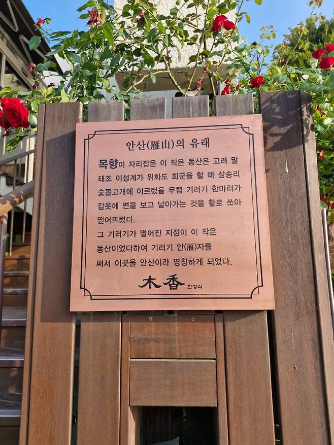 우리가 도착한 시간은 다행히 해가 아직 떨어지지 않은 6시 무렵. 건물 앞에는 이 식당 목향의 유래를 적어놓은 현판이 걸려 있다. 이 언덕이 안산이란다. 고려 말 태조 이성계가 위화도 회군을 할 때 삼송리 숯돌고개에 이르렀을 무렵 기러기 한마리가 갑옷에 변을 보고 날아가는 걸 활로 쏘아 떨어뜨렸는데 그 기러기가 떨어진 지점이 이 작은 동산이었다 하여 기러기 안자를 써서 안산이라고 명칭하게 되었다고 한다.