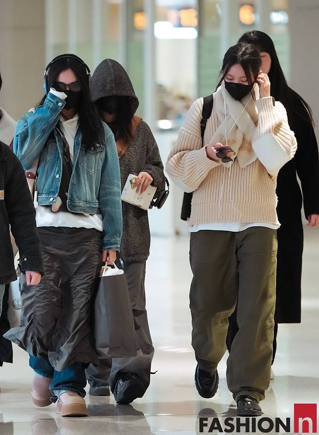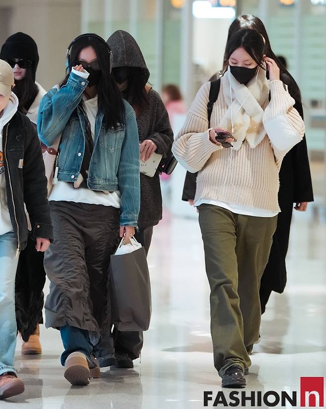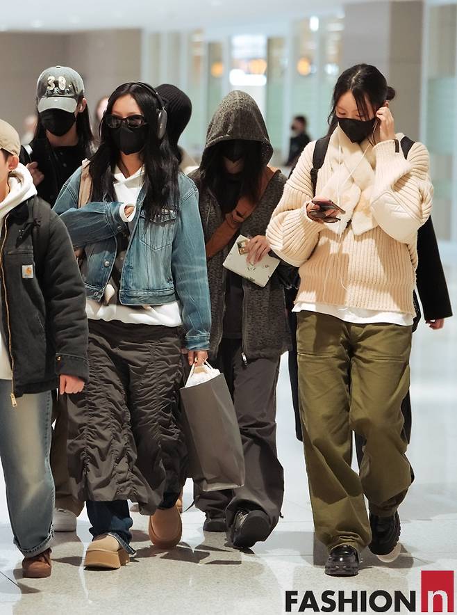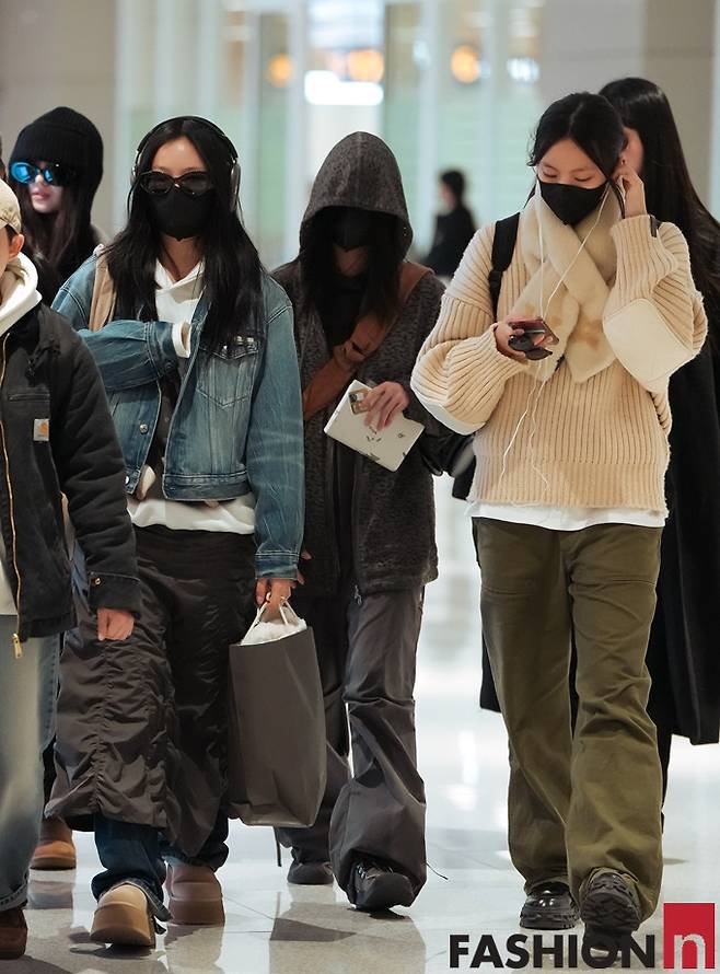 이날 뉴진스의 민지, 하니, 다니엘, 해린, 혜인은 마스크와 볼캡, 후드로 얼굴을 꽁꽁 가리고 데님 재킷과 니트 카디건, 후드 재킷, 코트 등을 입고 자유분방한 꾸안꾸 스타일로 5인5색 개성만점 입국룩을 선보였다.