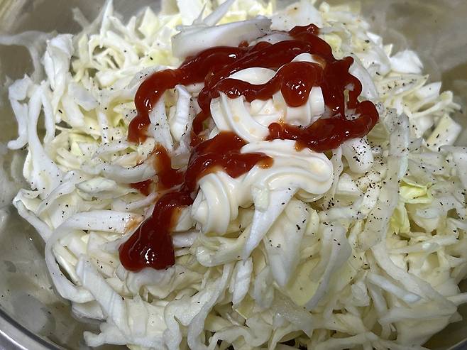 케첩은 1스푼 정도 넣은 다음 양념과 양배추를 잘 버무려 주세요. 소스가 너무 없어서 퍽퍽한 것보다는 소스가 넉넉히 있는 게 더 맛있습니다.