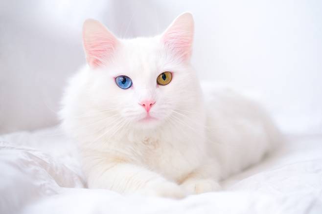 그리고 터키쉬 앙고라는 다른 고양이에 비해 양쪽 눈 색깔이 다른 오드아이인 경우가 많은데요. 오드 아이는 이색증(Heterochromia iridum)이라 불리며, 양쪽 눈 색깔을 결정하는 멜라닌 색소의 양이 달라서 그렇다고 합니다.