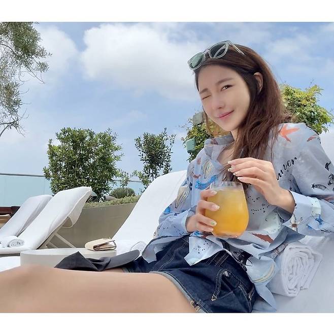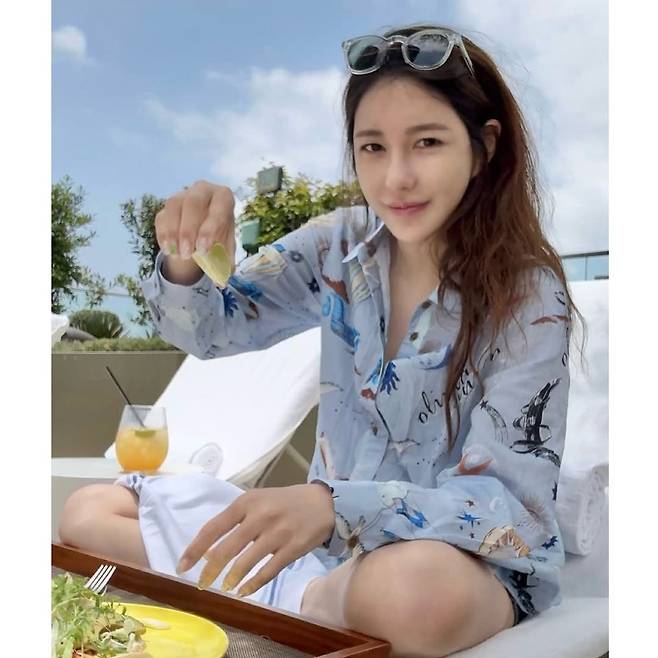액세서리는 미러 선글라스로 포인트를 줬다. 여유로운 테라스 분위기 속에서 반사된 빛이 그녀의 페이스라인을 더욱 또렷하게 살려주며, 전체 스타일에 세련된 마무리를 더했다. 테이블 위에 놓인 과일 칵테일과 어우러진 룩은 마치 한 편의 휴양지 화보처럼 여유롭고 고급스럽다.