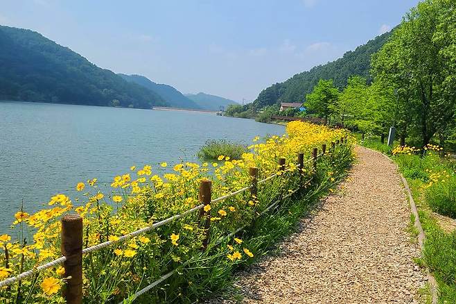 높은 언덕에 위치한 전망대에 올라 잔잔한 저수지를 한눈에 조망하는 특별한 시간을 가질 수 있습니다. 데크길을 걷다 보면 만나는 김득신 시인 동상과 함께 인상적인 사진도 남겨보세요.