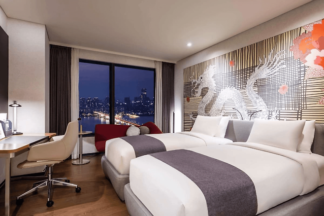 노보텔 앰배서더 용산은 서울드래곤시티 안에 위치한 대표적인 호캉스 호텔로, 불꽃놀이를 편안하게 감상할 수 있는 숙소 중 하나입니다. 한강과 남산이 내려다보이는 전망이 일품인 이곳은 가족 단위 여행객에게도 큰 인기를 끌고 있습니다. 특히, 슈페리어룸은 깔끔하고 세련된 인테리어와 넓은 창을 통해 도심과 한강뷰를 한눈에 감상할 수 있는 장점이 있습니다.