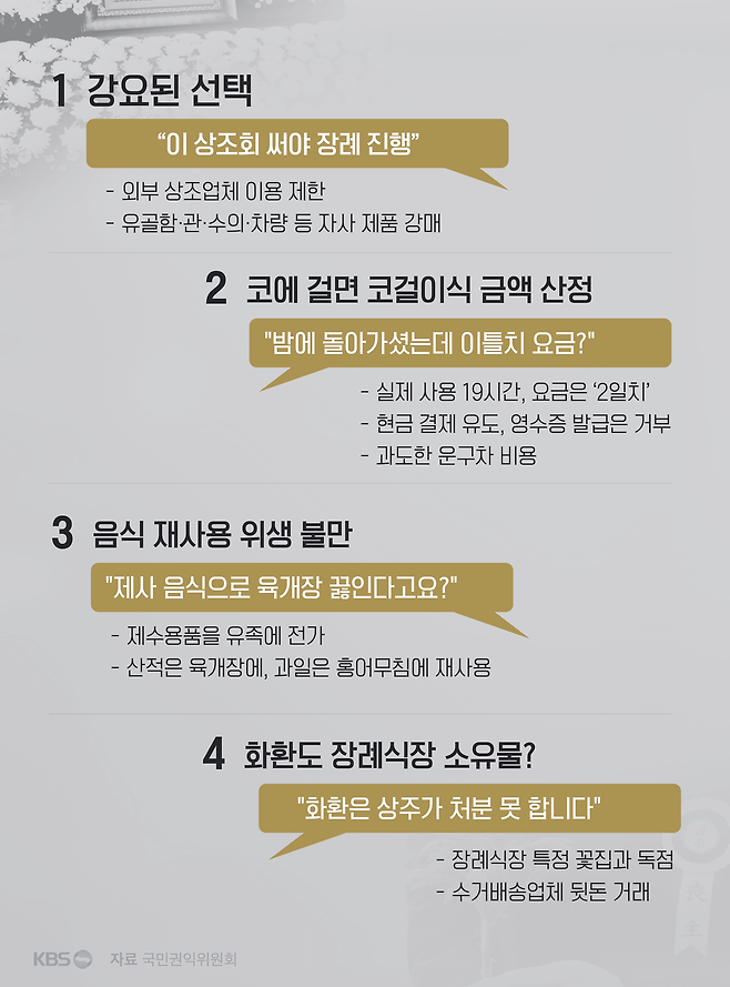 슬픔에 빠진 유족들의 처지를 악용하는 이런 관행이 근절되기 위해선 지자체의 철저한 정기점검과 함께 장례식장 스스로 양심적인 문화를 정착시키려는 노력이 뒤따라야 합니다.