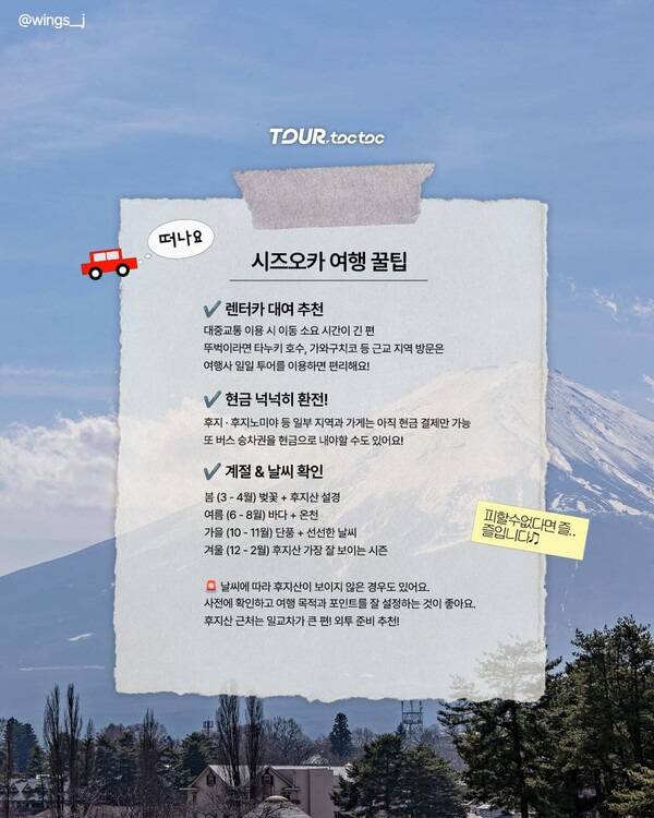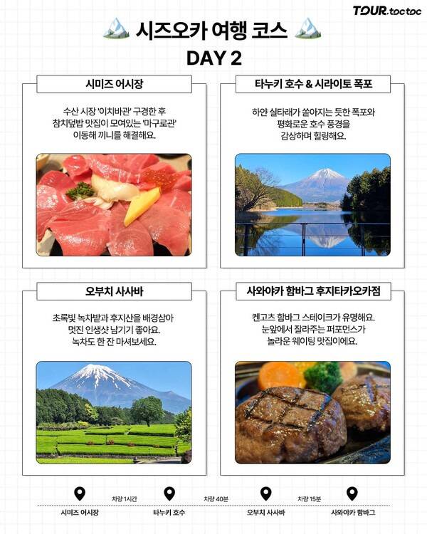 시즈오카는 후지산을 다양한 각도에서 감상할 수 있는 포토존의 보고입니다. 일본 소도시 특유의 여유로움 속에서 자연, 맛, 감성을 모두 누릴 수 있는 2박 3일 여행지로 적극 추천합니다.