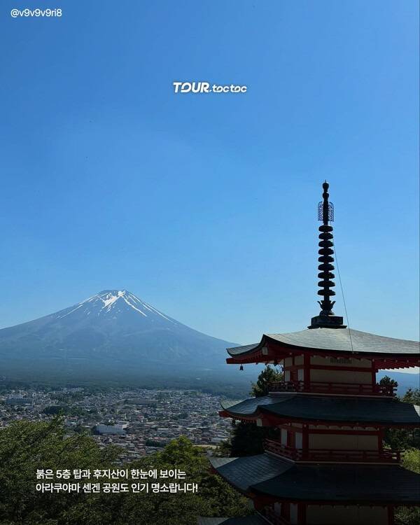 붉은 5층 사찰 탑과 후지산이 한눈에 담기는 아라쿠야마 센겐 공원도 여행객들이 많이 찾는 명소입니다. 후지산 전망대로도 유명하며, 봄에는 핑크빛으로 만개한 벚꽃과 후지산, 5층 탑이 어우러져 특별한 자연 경관이 펼쳐집니다.