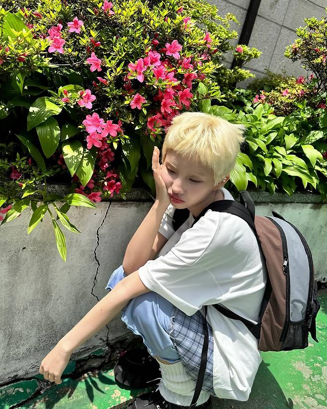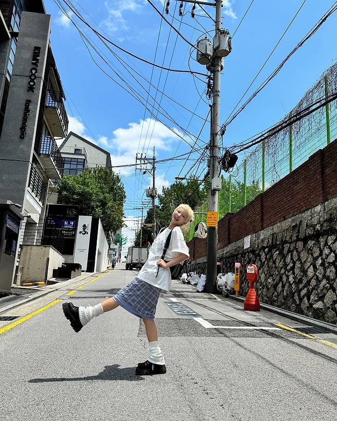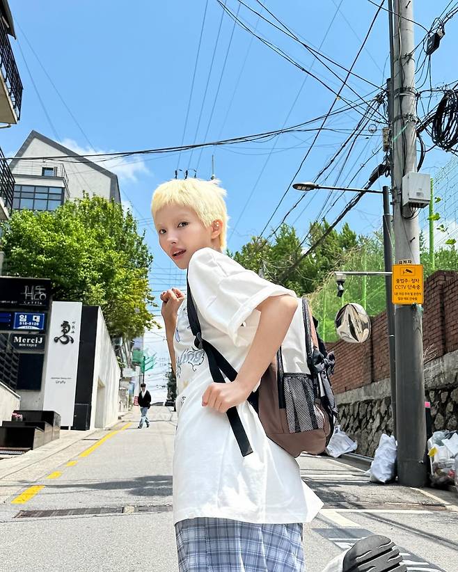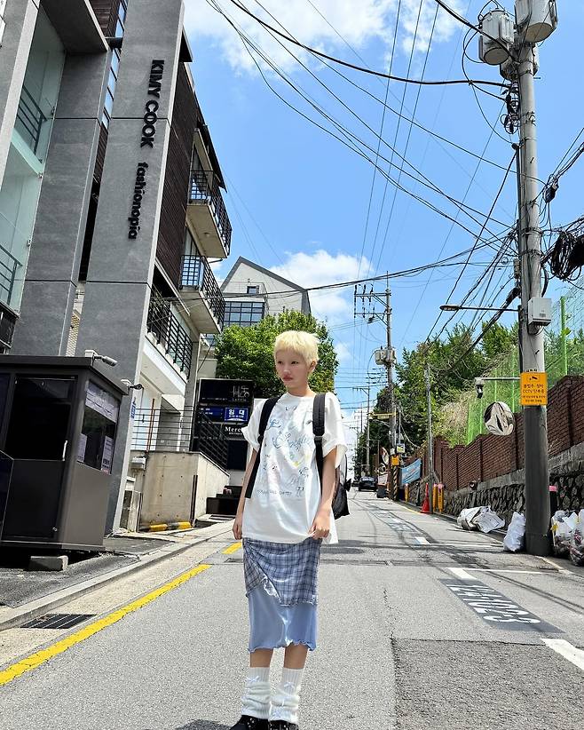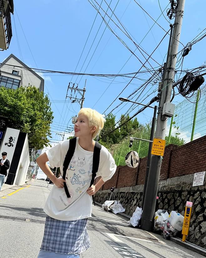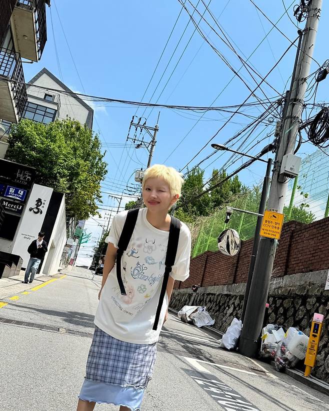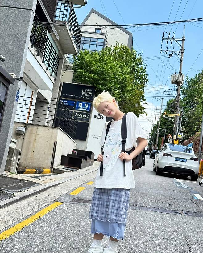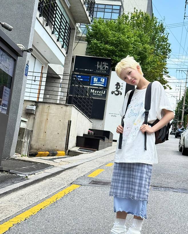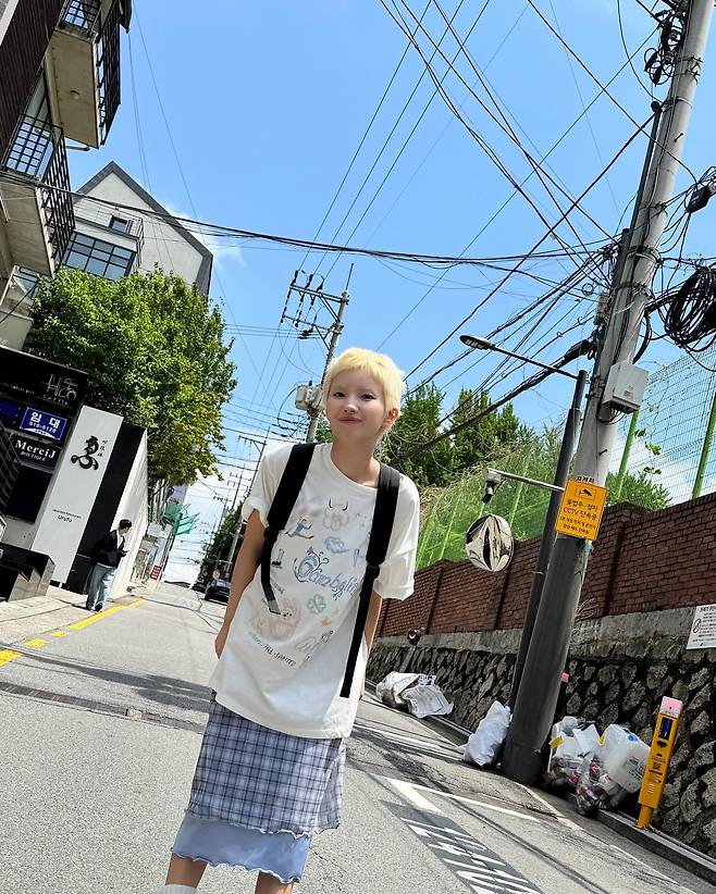 금발 숏컷과 꾸안꾸 백팩, 루즈한 프린팅 티셔츠에 언밸런스한 체크&새틴 믹스 스커트까지