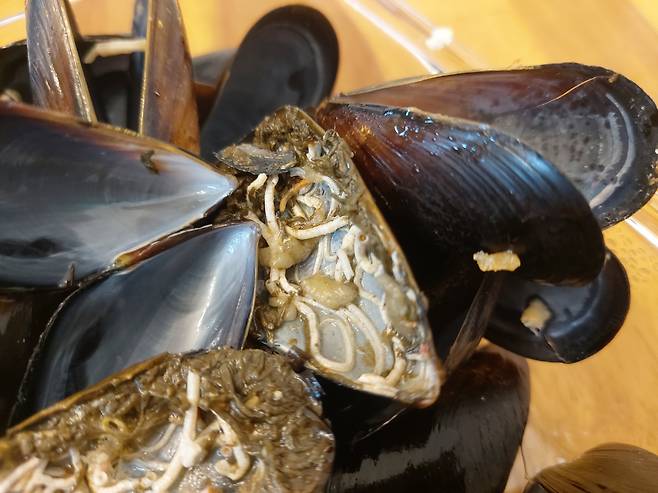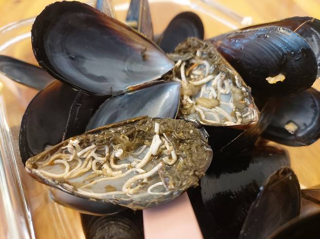 홍합 중 하나가 썩었는지 내부에 회충 같이 생긴 벌레들이 딱딱하게 굳어서 죽어 있는 거 같고, 겉에는 해초들이