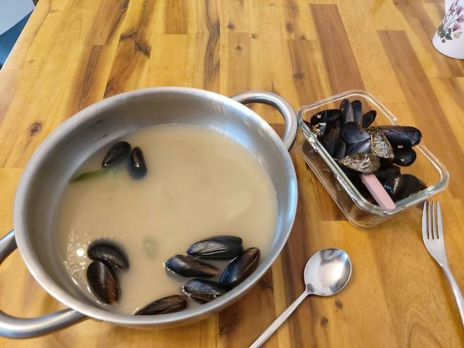 와이프가 가는 반찬가게에서 오늘 홍합탕 행사를 했나 봅니다. 홍합 좋아해서 저녁에 뜨뜻하게 먹으면 좋을 거 같고