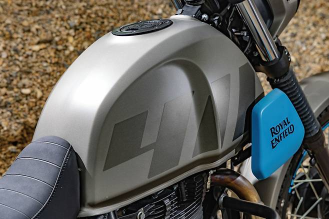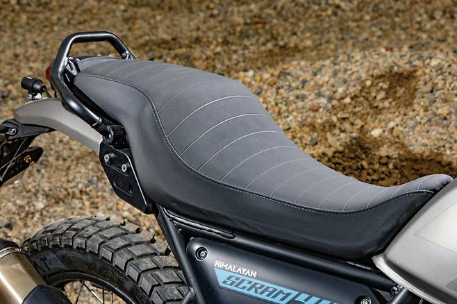 화이트 플레임, 실버 스피릿, 블레이징 블랙, 스카이라인 블루, 그라파이트 레드, 그라파이트 블루, 그라파이트 옐로까지 총 8가지 컬러의 모델이 있는데 각기 다른 연료 탱크 그래픽 디자인과 로얄엔필드 로고가 삽입된 사이드 패널로 특색을 갖췄다. 히말라얀에 장착되었던 평평한 디자인의 투 피스 시트와 달리 일체형 시트가 적용됐고 가로줄 엠보싱으로 클래식 무드를 더했다. 이어 프레임 사이를 덮은 커버에는 히말라얀 스크램 411 로고가 적용되어 그 베이스 모델과 지향점을 알려주고 있다.