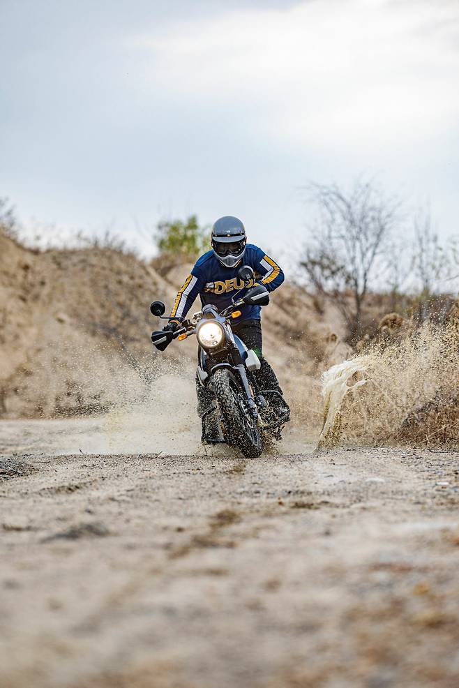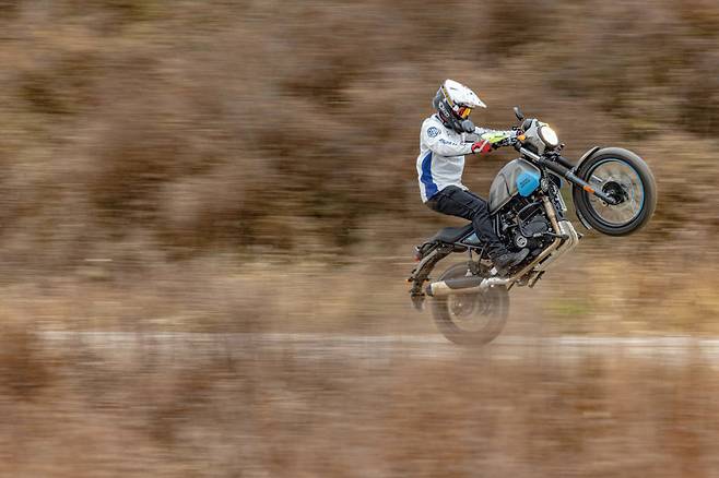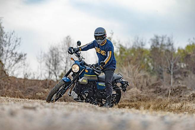 오프로드에 들어서면 묵직한 차량 무게와 부드러운 토크 특성이 더욱 빛을 발휘한다. 스로틀을 과감하게 열며 출발해도 차량이 안정적인 자세를 유지하고 리어 휠이 미끄러지더라도 스로틀을 살짝 풀면 이내 그립을 찾아낸다. 즐거운 점은 히말라얀에 비해 가벼워진 덕분인지 출발과 함께 풀 스로틀을 하면 꽤 오랫동안 땅을 파내며 앞으로 나아간다는 점이다. 히말라얀은 인위적으로 리어 휠을 스핀 시키려고 해도 묵직한 무게와 연한 토크 때문에 금방 그립이 잡혀버렸다. 즉, 스크램 411은 무게가 가벼워진 만큼 순간적으로 출력을 더 효과적으로 꺼내 쓸수 있다. 이는 더 다양한 스킬을 구사하거나 더 높은 난이도의 코스를 주파할 수 있다는 의미다.