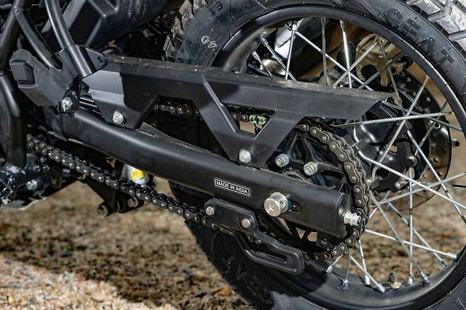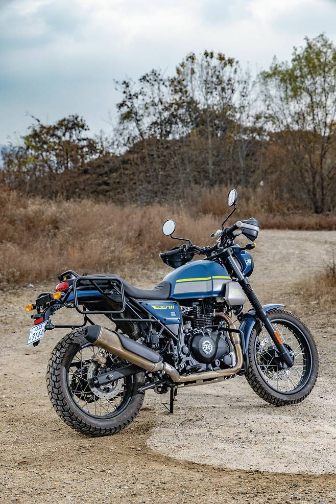 히말라얀은 전방에 21인치 휠을 적용해 오프로드 주행 능력에 치중했지만, 스크램 411은 전후 19인치, 17인치 휠을 적용해 온로드 주행의 비중을 높였다. 또한, 전방 서스펜션의 트래블을 10mm 줄여 무게 중심을 낮추고 불필요한 상하 운동을 억제했다. 시트고는 5mm 낮아져 795mm이며, 최저지상고는 20mm낮은 200mm로 설계됐다. 시동을 걸면 익숙한 진동과 배기음이 올라온다. 로얄엔필드 단기통 특유의 툴툴거리는 배기음과 손끝을 툭툭 치는 진동이 재미있다.