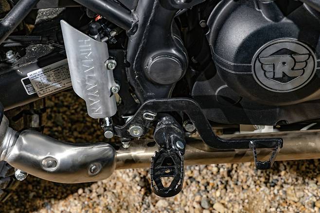히말라얀은 전방에 21인치 휠을 적용해 오프로드 주행 능력에 치중했지만, 스크램 411은 전후 19인치, 17인치 휠을 적용해 온로드 주행의 비중을 높였다. 또한, 전방 서스펜션의 트래블을 10mm 줄여 무게 중심을 낮추고 불필요한 상하 운동을 억제했다. 시트고는 5mm 낮아져 795mm이며, 최저지상고는 20mm낮은 200mm로 설계됐다. 시동을 걸면 익숙한 진동과 배기음이 올라온다. 로얄엔필드 단기통 특유의 툴툴거리는 배기음과 손끝을 툭툭 치는 진동이 재미있다.