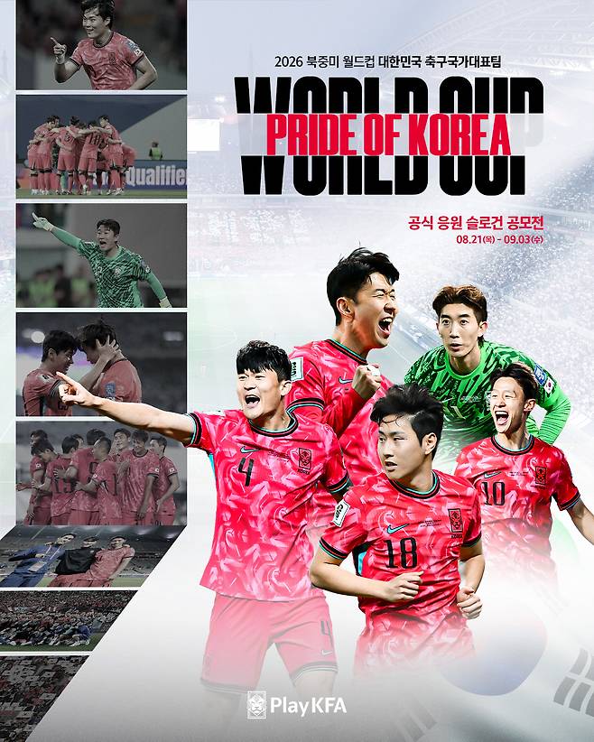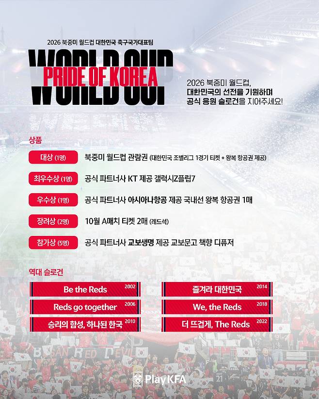 대한축구협회(KFA)가 2026년 북중미월드컵에서 대한민국 축구대표팀을 응원할 공식 슬로건을 팬 공모를 통해 선정한다.