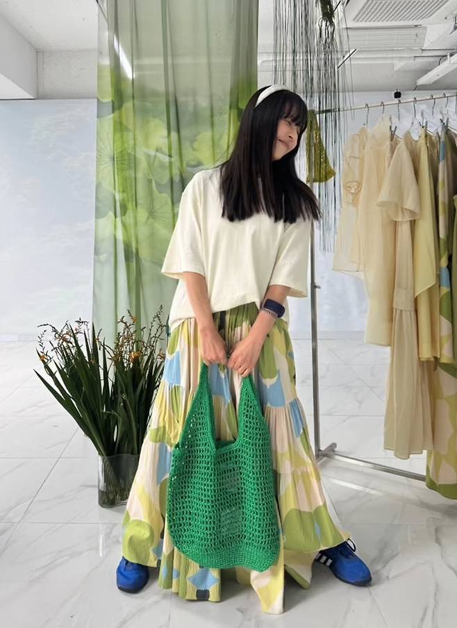 여기에 선명한 컬러감의 그린 네트백, 블루 컬러 운동화, 화이트 헤어 밴드 등을 매치해 편안함과 활동성을 갖춘 여름 스타일링을 선보였다.