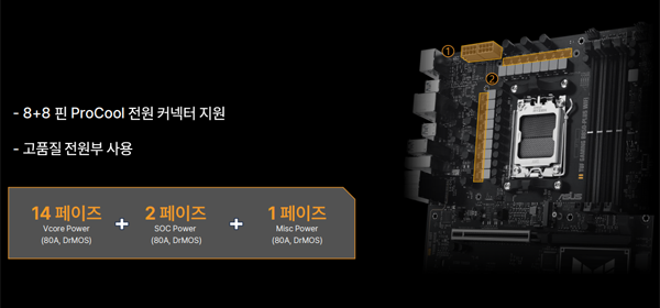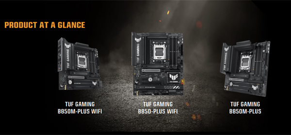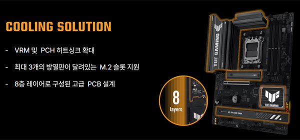 AMD B850 메인보드 중에서는 TUF 시리즈도 나온 TUF GAMING B850M-PLUS WIFI, B850-PLUS WIFI, B850M-PLUS에 대해 설명했는데, 8+8핀 ProCool 전원 커넥터를 지원하고 고품질 전원부를 사용하며, VRM 및 PCH 히트싱크 확대, 최대 3개의 방열판이 달려있는 M.2 슬롯 지원, 8층 레이어로 구성된 고급 PCB 설계, 그리고 엔비디아 지포스 RTX 50 시리즈와 같은 차세대 그래픽 카드를 사용하기에 적합한 PCIe 5.0 그래픽 카드 슬롯 지원을 특징으로 꼽았다.