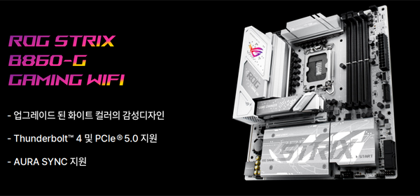 인텔 B650 메인보드 가운데 추천하는 제품으로 ROG STRIX B860-G GAMING WIFI을 언급하면서 B760과 달리 블랙에서 화이트 컬러로 감성적인 디자인을 제공하고, VRM 부분 히트싱크 커버와 M.2 전용 히트싱크 및 M.2 백플레이트 설계가 적용됐다. 썬더볼트 4 및 PCIe 5.0 지원, AURA SYNC 지원, 14 페이즈 전원부 구성, 그리고 Wi-Fi 7 지원이 가능하다. 또한 인텔 시리즈는 어려운 메인보드 기능에 대한 대화형 AI 기능을 제공하는 AD 어드바이저가 탑재되어 소프트웨어적으로 지원된다.