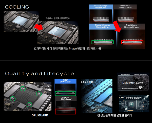 또한 GPU에 기존 써멀 그리스나 리퀴드 써멀 대신 페이지 변환형(Phase-Change) 써멀 패드를 적용해 장시간 사용하더라도 써멀 패드가 굳거나 떨어져서 냉각 효과가 줄어드는 현상을 방지할 수 있다.