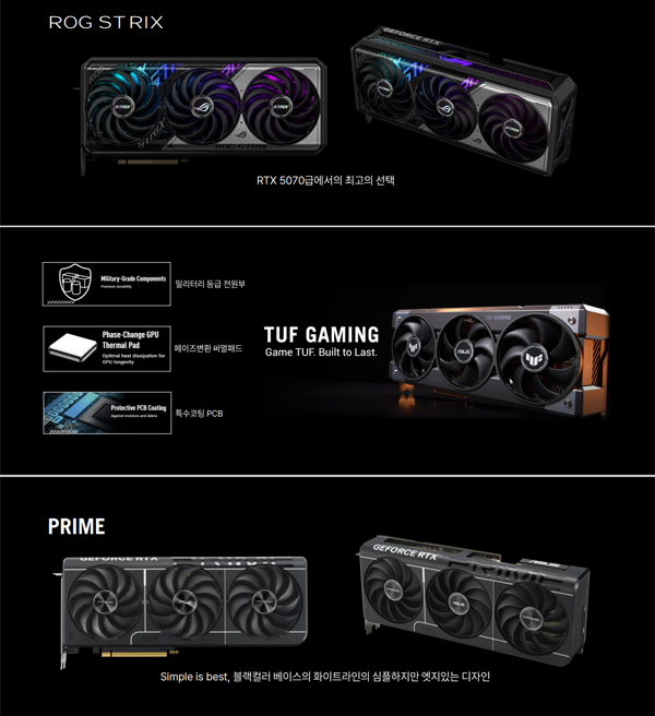 끝으로 PRIME 시리즈는 화려한 RGB LED 없는 심플한 블랙 컬러 기반의 화이트 라인을 특징으로 하며 SFF 시스템에서도 설치 가능한 2.5 슬롯 디자인, 듀얼 볼 베어링이 적용된 쿨링 팬, 페이즈 변환 써멀 패드, 베이퍼 챔버 쿨링 솔루션을 탑재했다.
