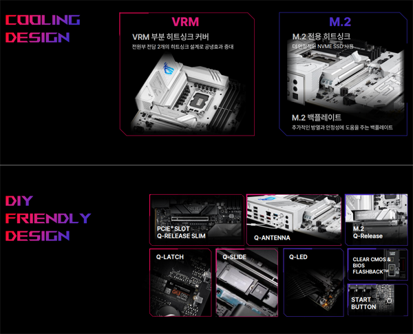 그 밖에 사용자 및 파트너의 편리한 PC 조립을 위해 PCIe 슬롯 Q-릴리즈 슬림, Q-안테나, M.2 Q-릴리즈, Q-래치, Q-슬라이드, Q-LED, CMOS 바이오스 클리어 및 플래시백, 시작 버튼, 그리고 바이오스 Q-대시보드 등에 대해 설명했다.