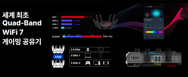 먼저 ROG RAPTURE GT-BE98은 작년부터 차세대 무선 기술로 본격화되기 시작한 Wi-Fi 7을 지원하는 고급형 유무선 공유기로 320Hz 대역폭과 멀티 링크 동작(MLO), MRU 및 Puncturing 등이 포함된 Wi-Fi 7 기술과 8개의 고성능 안테나, 그리고 듀얼 5GHz 밴드가 포함된 쿼드밴드 Wi-Fi 7 로 최대 25Gbps의 속도를 제공한다. 여기에 게임 성능을높이기 위한 게임 전용 10G 유선 LAN 포트, 게이밍 기어 가속 기능, 모바일 게임 모드, Trend Micro의 네트워크 보호 기능을 제공한다.