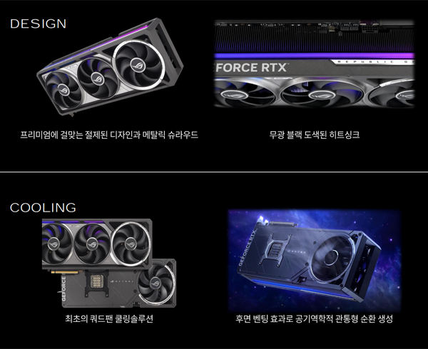지포스 RTX 5090/5080와 같은 프리미엄 기종에 사용되는 ROG ASTRAL 브랜드는 프리미엄에 걸맞는 RGB LED 사용을 줄인 절제된 디자인과 메탈릭 슈라이드 디자인, 내부 히트싱크까지 무광 블랙 도색된 고급스러움을 특징으로 한다.