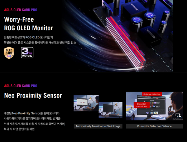 또한 맞춤형 히트싱크와 ROG OLED 모니터만의 특별한 에어 플로우 시스템을 통해 냉각을 개선하여 OLED 모니터의 약점으로 꼽히는 번인 위험을 감소시켰며, 내장된 신형 근접 센서(Neo Proximity Sensor)가 사용자와 모니터 사이의 거리를 감지하여 사용자가 자리를 비웠을 때 자동으로 화면이 꺼지고 복귀했을 때 화면이 복원되는 방식으로 장시간 자리를 비웠을 때 모니터에 번인 현상이 발생하지 않도록 했다.