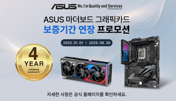 작년에 이어 올해도 ASUS 메인보드와 그래픽 카드에 대한 보증기간 연장 프로모션을 6월 30일까지 진행한다. 국내 정식 출시된 제품을 구매하고 14일 이내에 ASUS 공식 홈페이지를 통해 등록하면 기존 3년에 추가 1년이 더해진 총 4년의 A/S 기간을 적용받게 된다.