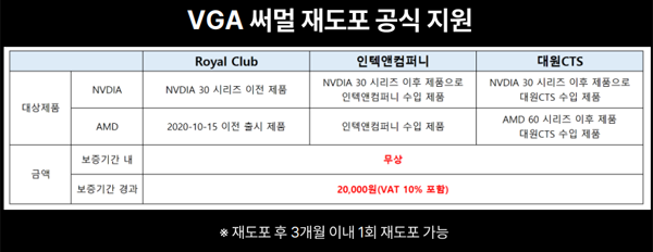 한편, ASUS 코리아는 ASUS 그래픽 카드 사용자들 사이에서 의견이 분분한 써멀 재도포 정책에 대해서도 명확한 규정을 발표했다. 엔비디아와 AMD 제품 모두 가능하며 오래된 제품들은 ASUS 로얄 클럽에서 RTX 30 시리즈 이후 출시 제품 및 인텍앤컴퍼니와 대원CTS가 수입한 제품은 유통사 A/S 센터를 통해 지원하며, 보증기간 내에는 무상으로, 보증 기간이 지난 제품도 2만원의 비용을 지불하면 써멀 재도포 서비스를 받을 수 있다.