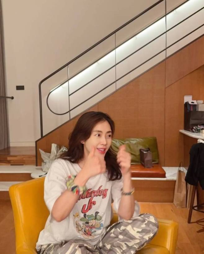 집에서는 디즈니 캐릭터가 프린트된 그레이 맨투맨을 착용하며 편안한 홈웨어 룩을 선보이고 있다. 양손으로 브이 포즈를 취하며 밝은 미소를 짓고 있어, 일상 속에서도 긍정적인 에너지를 표현하고 있다.