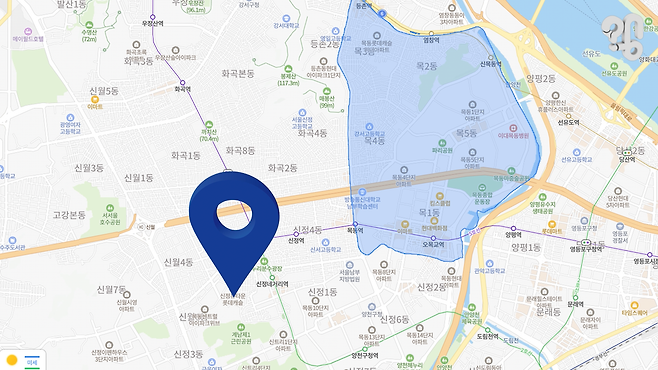 ‘목동’이라는 지명을 사용하면 브랜드 가치가 높아지고, 그에 따른 집값 상승도 기대할 수 있다는 논리다. 문제는 해당 아파트가 행정구역상은 물론 생활권 기준으로도 ‘목동’에 위치한 곳이 아니라는 점.