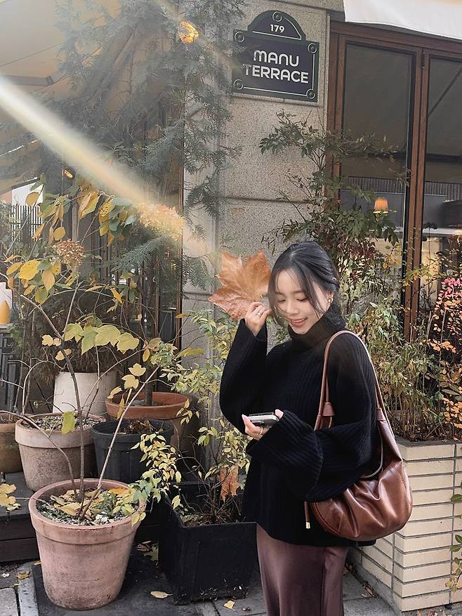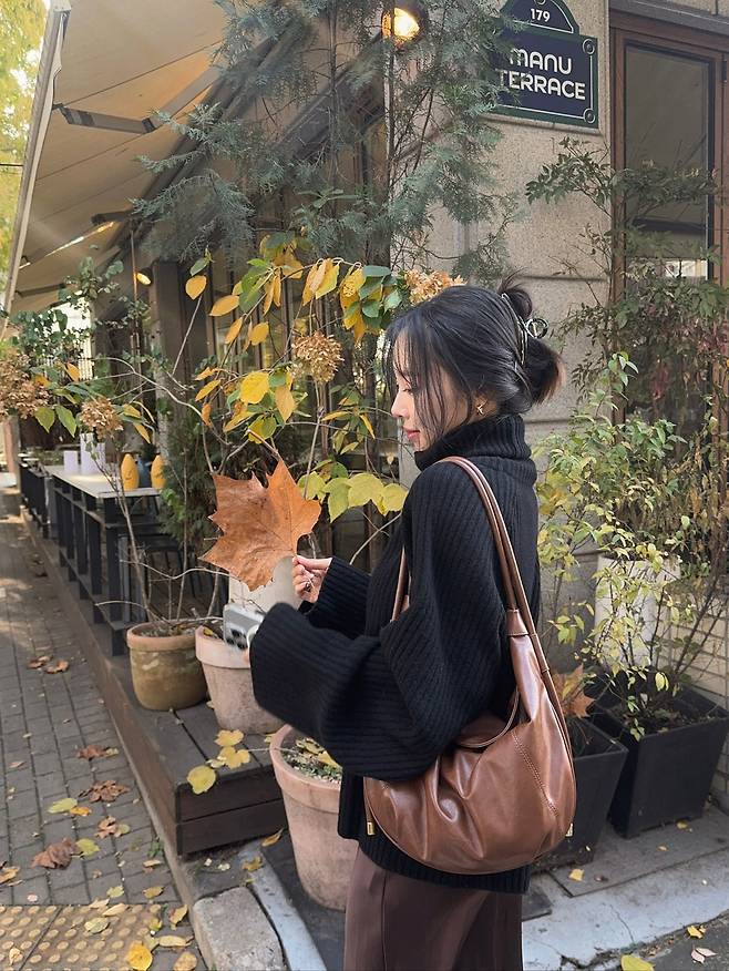 브라운 가죽 숄더백은 전체 룩의 온도를 부드럽게 높여주는 포인트가 되고 있어요.