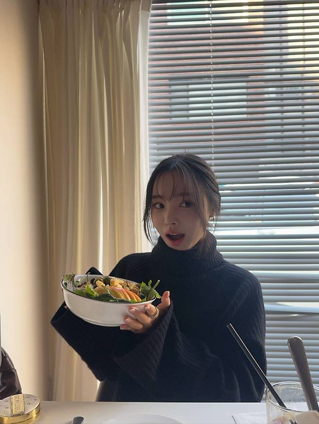 음식과 함께 찍은 컷에서는 특유의 발랄함과 귀여운 표정이 드러나면서 룩을 더욱 생동감 있게 보여주고 있어요.