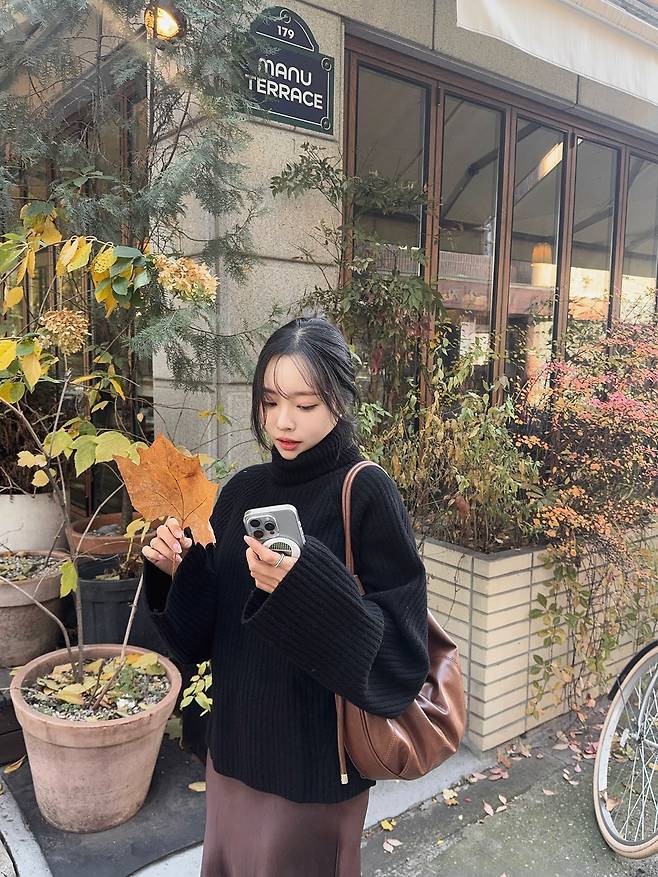 깊은 블랙 컬러의 니트 터틀넥은 넉넉한 소매 라인이 매력적으로 드러나며, 편안하면서도 고급스러운 분위기를 만들어주고 있어요.