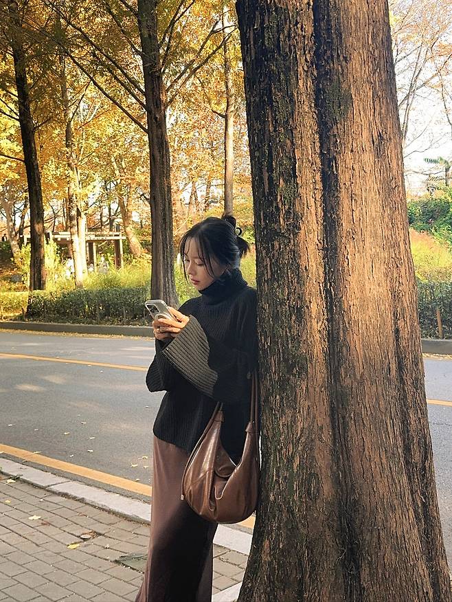 가을 햇살 아래 나무에 기대서 휴대폰을 바라보는 장면은 마치 한 장면의 화보 같아요.