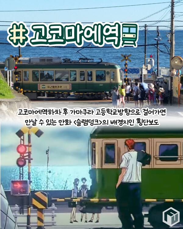 가마쿠라의 상징과도 같은 슬램덩크의 한 장면을 볼 수 있는 역입니다. 에노시마 역에서 에노덴을 타고 가마쿠라 고코마에 역에서 하차해 가마쿠라 고등학교 방향으로 걸어가면 <슬램덩크>의 한 장면을 재현할 수 있는 횡단보도를 만날 수 있습니다.