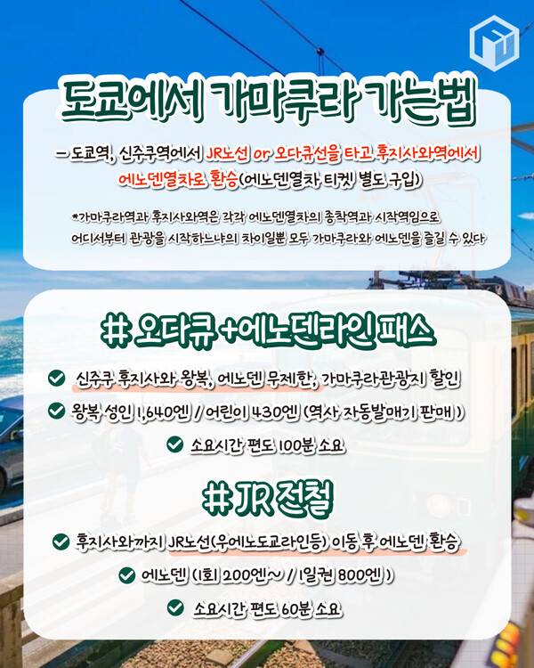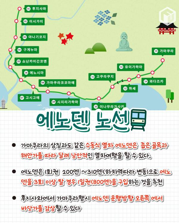 가마쿠라역과 후지사와역은 가마쿠라의 전철인 에노덴의 각각 종점과 시작점이기 때문에 목적지에 따라 적절한 교통편을 선택하시면 좋습니다.