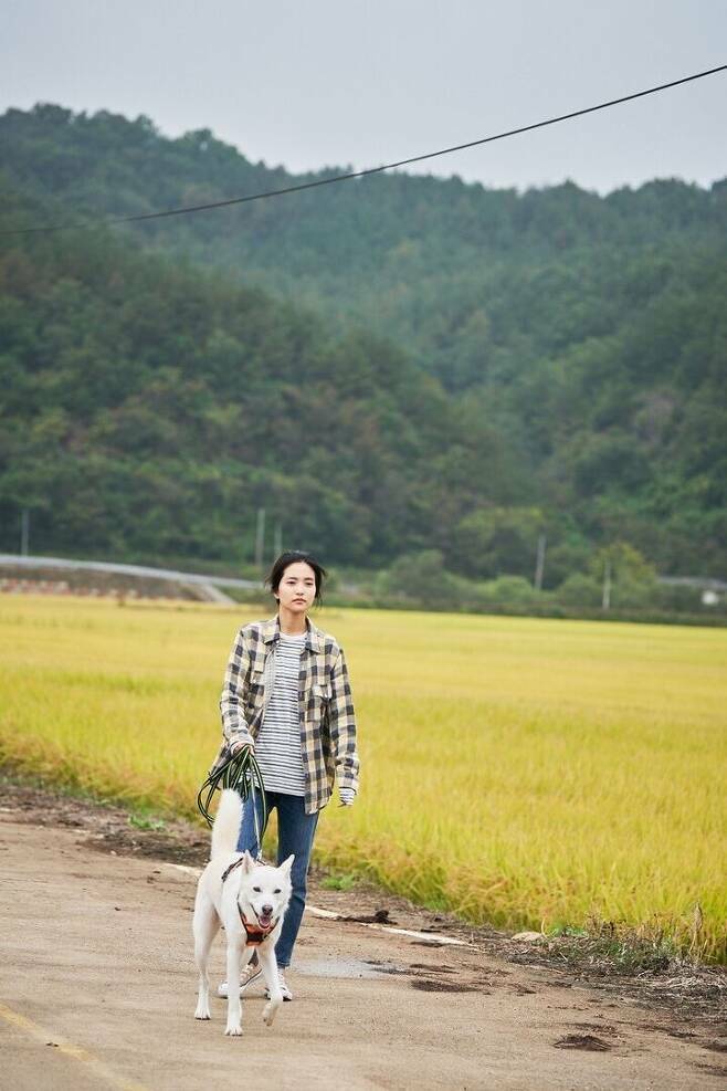 가을 장면. 혜원이 벼 밭 사이를 자전거로 달리자 오구로 보이는 개가 뒤따라 달려온다.